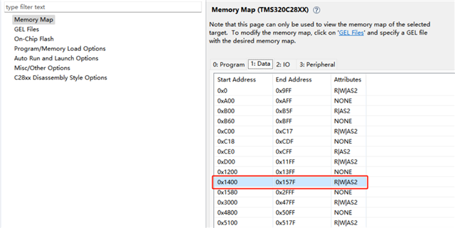 2、GEL文件中这个地址段的定义是在data中,ccs的expressions显示的是memroy map在program中