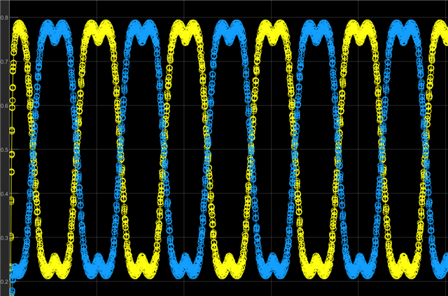 • (1)理想情况下每个管子的平均占空比都是50%,你可以观察svpwm输出的Ta Tb Tc,以上下计数为例,他马鞍波的最大值和最小值的平均,就是上下计数载波最大值的一半。即下图为A相上下两桥的等效调制波,中心是0.5