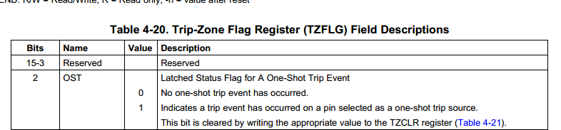 One-shot是EPWM tripzone模块的一个模式,你可以到TI官网下载SPRUG04A来学习Tripzone模块。主要功能就是当某些事件发生(比如过流,过压),会给TZ输入引脚一个触发电平,此时tripzone就可以直接封锁PWM的输出,以保证系统的安全,one-shot模式的意思,当tripzone使能封锁PWM后,必须复位寄存器才能重新使能PWM输出,否则就始终处于保护状态。