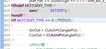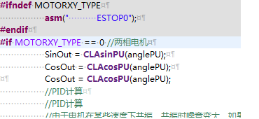 然后编译,没任何错误提示,烧录也正常,但是运行时电机明显缺一相电流,也就是说,那个丢失色彩的函数确实没有正确调用到。必须删除那句代码前面一些字符,加亮色才会重新出现,代码正常运行。