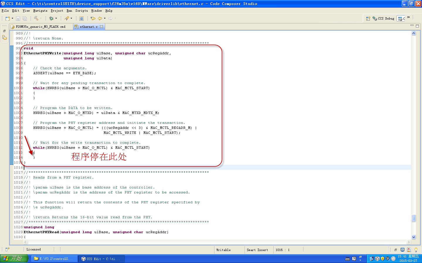 ethernet.c 中 EthernetPHYWrite 函数中的第二个while()语句,代表不断查询直至写发送完成。