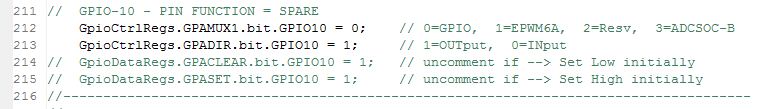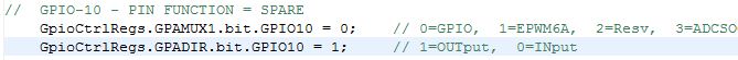 GPIO10设置为通用GPIO口,作为输出使用,读的寄存器是GpioDateReg.GPASET.Gpio10位值,