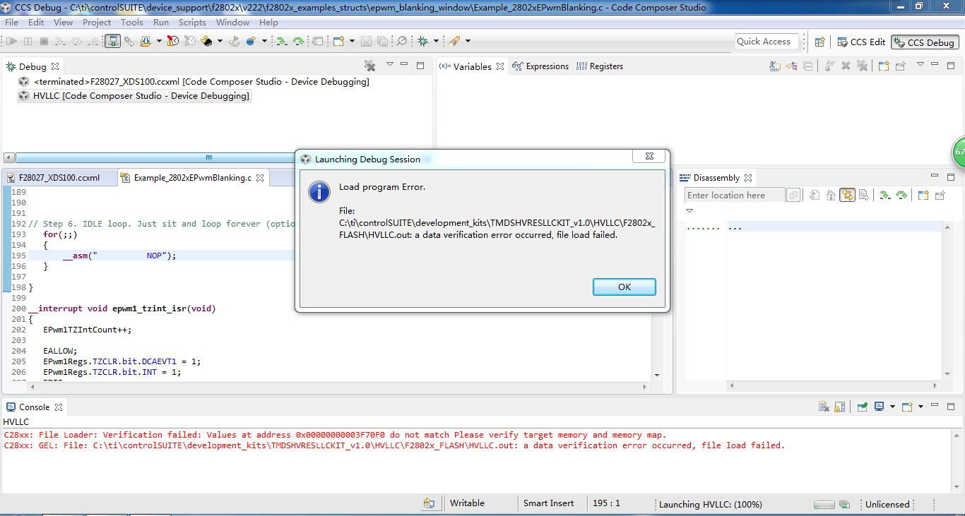 我在TI 官网上买了个谐振开发套件,请问我用的LLC谐振开发套件,用controlsuite中的程序,编译成.out文件后,进行debug 但是load program时候,总是出现这个错误,是什么原因,怎么解决?