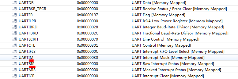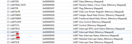 但是这样之后,CPU并没有进入到Uart中断函数。我通过CCS 发现UARTRIS 寄存器的TXRIS并没有置位,如图1所示,这意味着不满足发送中断。