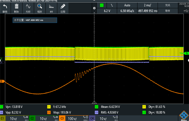 图2中橙色正弦波为逆变电压波形,蓝色为PWM2A波形,黄色为PWM1A波形,绿色为PWM1B波形。