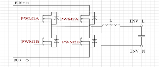 PWM1A和PWM1B输出互补,开关频率66kHz,PWM2A和PWM2B输出互补,开关频率50Hz。在逆变电压正半周时,PWM2A输出为低,PWM2B输出为高PWM1A占空比按正弦规律变化,PWM1B和PWM1A互补。在逆变电压负半周时,PWM2A输出为高,PWM2B输出为低,PWM1B占空比按正弦规律变化,PWM1A和PWM1B互补。