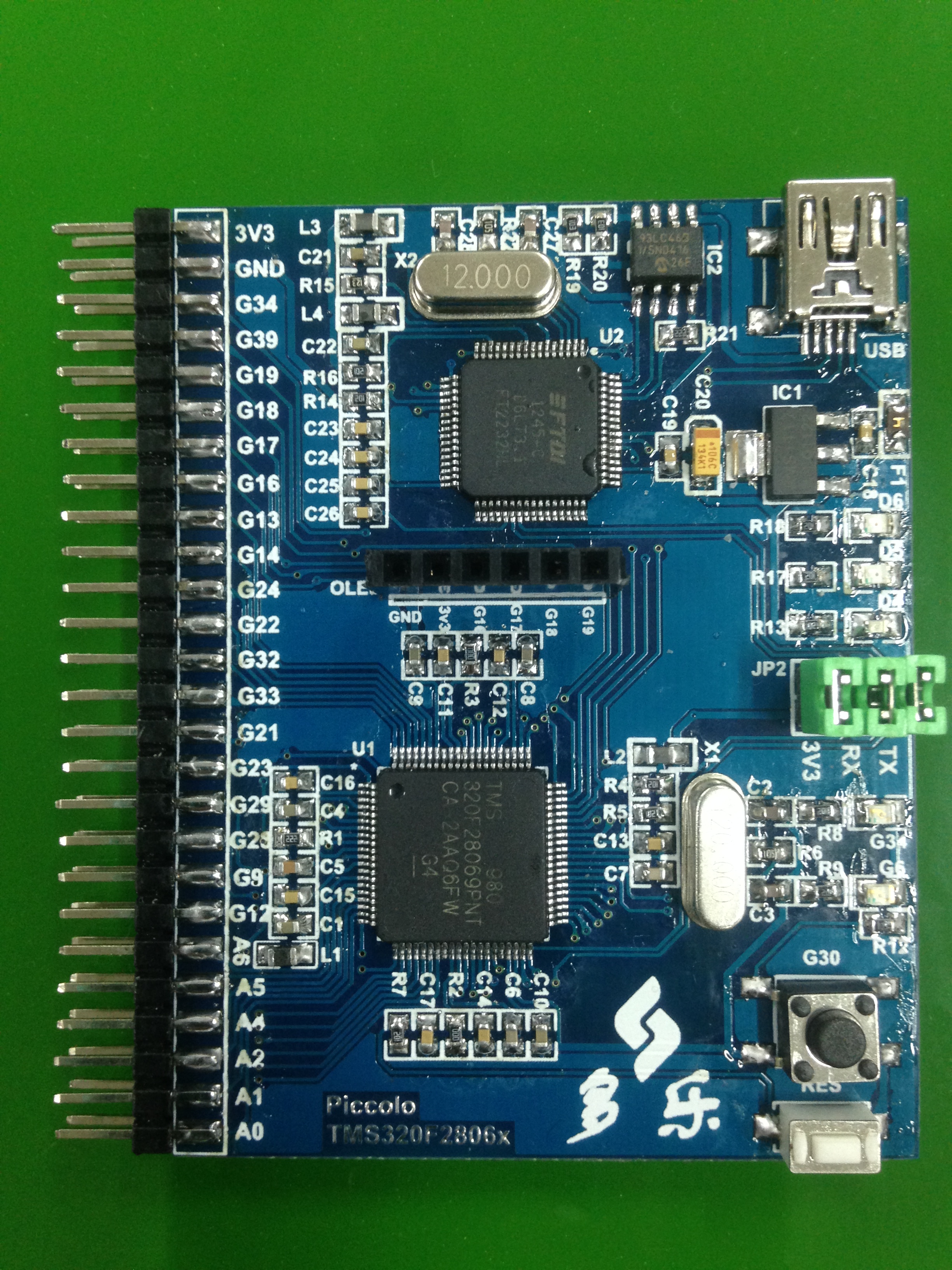 后来在做一些项目发现,28027很多功能和模块有限,就开始研究28069,今年年初,尝试自己画最小系统板,并且把仿真器和最小系统板合在一起,画了一块板子(下图蓝色板子),现在还在用和学习中。28069没有像28027那样有库函数可以调用,基本都是要自己照着技术手册配置寄存器。前段时间配置了I2C,调试TI的BQ32000实时时钟芯片,发现成功没问题,可以成功的读取时间,只是还没做到可以自由调试时间。后来想,28027的I2C都还没开始研究,要不要试试看,就花了一天的时间都在研究28027的I2C,发现要是调用库,根本很难,调试了一天都不成功。后来到了晚上,回到宿舍,想到能不能照着28069的方式,直接配置寄存器,然后就开始动工了,还把28069很多写好的程序直接复制过去,用了BMP180温度气压传感器测试,嘿,完全可以用。欣喜啊,就是有些不好的地方,ti的芯片实在宝贵,好容易锁掉。之前学习28027锁了好多,一直没办法解锁;学习28069的时候,在调试AD模块,因为调用库里面一个延时的程序,就把芯片锁了。去ti官方申请样品,一次也只能申请一片,买又好贵。(附件这边是我的28027用I2C测试BMP180程序,并且有OLED液晶显示)