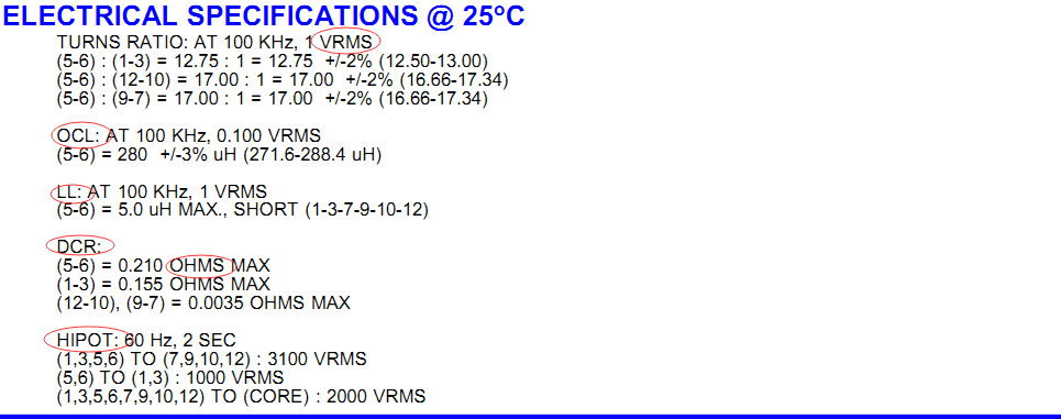 如图所示,该变压器是LLC谐振套件上的一个变压器,型号为75p8105,其中VRMS,OCL,LL,DCR,OHMS,HIPOT分别为什么意思?