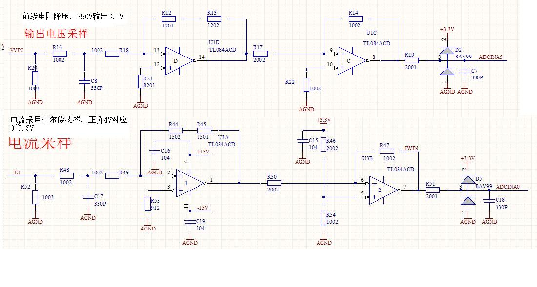 我的电压采样对技术文档差不多,电阻降压后经过运放,850V输出3.3V,正常输入是380V。母线就是540V。测量板子上母线电压输入到芯片引脚是1.805V