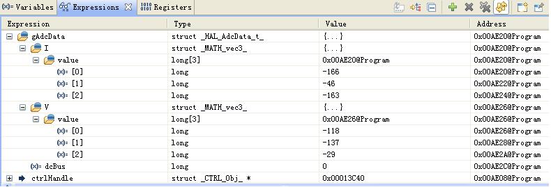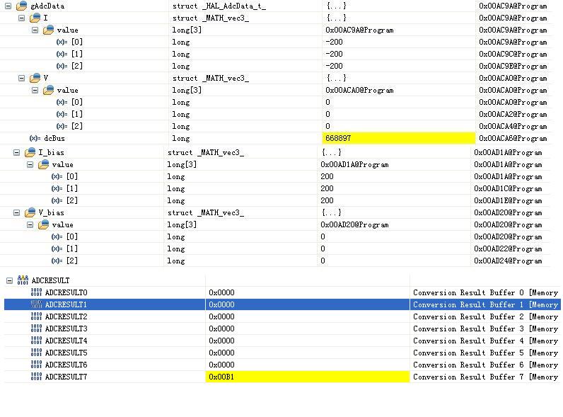 我使用的28068FFPT芯片,自己做的硬件,运行SPIN_FOC例程lab10c的程序,发现AD运行一次三相电流电压就不更新了,dcBus的值时有时无(如下图),中断运行都正常,请问这是什么原因。