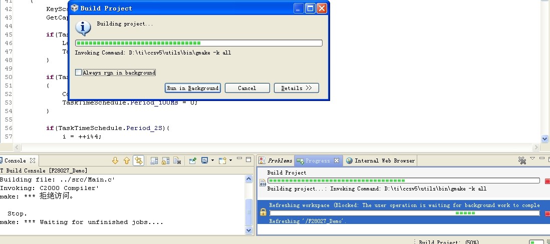 CCS5.2编译程序时卡死了,编译进度停留在50%的地方,请问怎么解决呢?