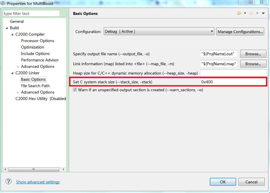 #10210-D creating ".stack" section with default size of 0x400; use the -stack option to change the default size