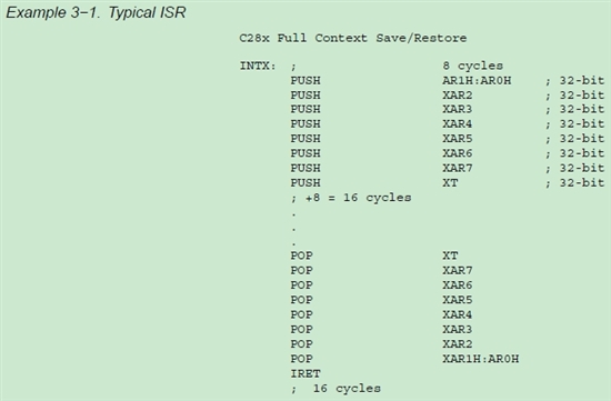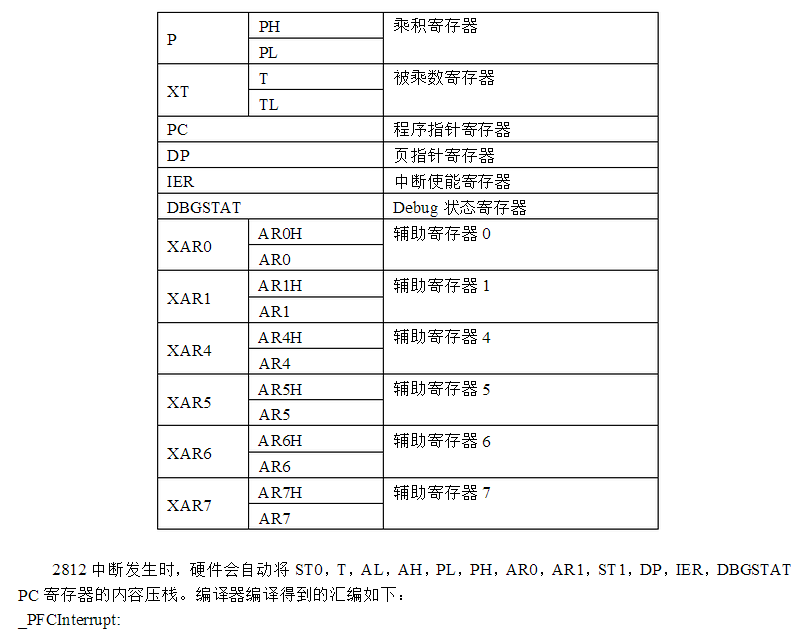 spru430e P93页提及,ISR执行前自动保存ST0/T,AL/AH,PL/PH,AR0/AR1,ST1/DP,IER/ DBGSTAT,return address等。