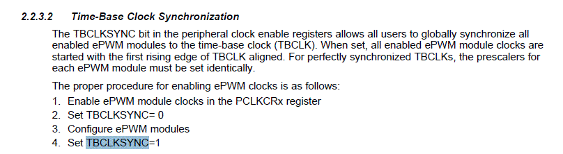 要使用ePwm1,就必须两个时钟都使能,EPWM1ENCLK是外设时钟的输入使能,TBCLKSYNC是外设的输出使能,它控制时钟什么时候开始。