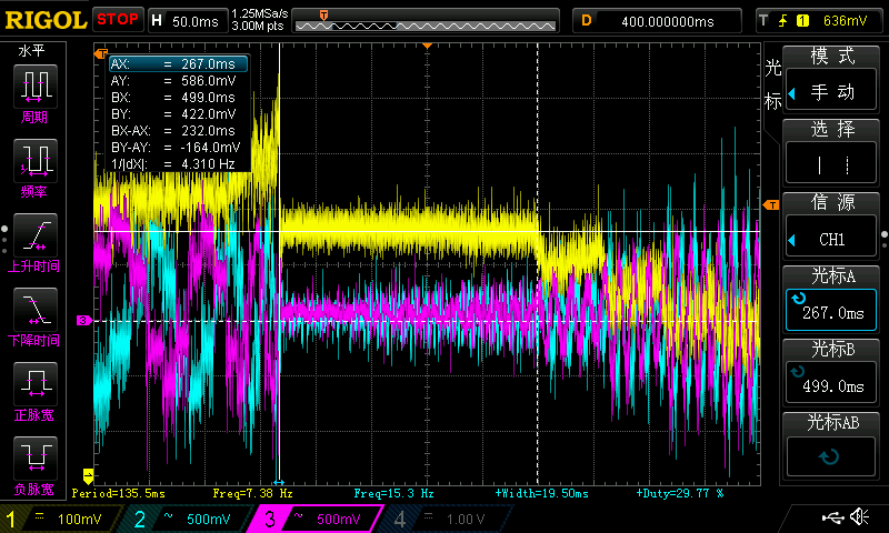 问题2:同样的程序和参数,三次实验现象都不一样,有时候能稳定几百ms,有时候一瞬间就报过流;