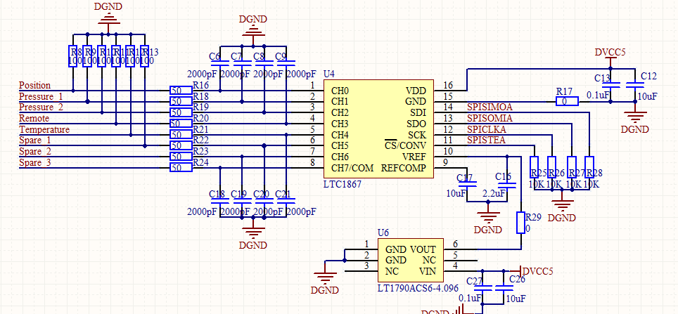 现在在做一个F2812外置AD的电路板 控制器是TI C2000系列的F2812 外置AD芯片是凌特的16bit 200ksps LTC1867 利用DSP的SPI实现数据的转换,按照芯片绘制了电路原理图和PCB如下图所示,也能把信号采集上来,就是跳动比较厉害,小数点后百分位都保证不了,例如:万用表测得电压是1.2345V (万用表测的时候最后一位跳动)