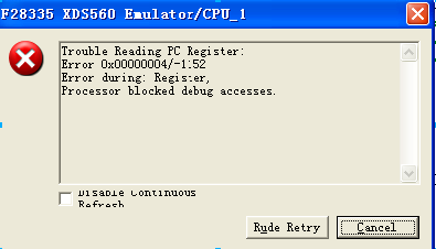 使用XDS560PLUS仿真,芯片为DSP28335,在实时仿真时会出现错误,Trouble Reading PC Register --- ERROR 0x00000004/-1:52 -----Error during:Regis:er -----Processor blocked debug accesses