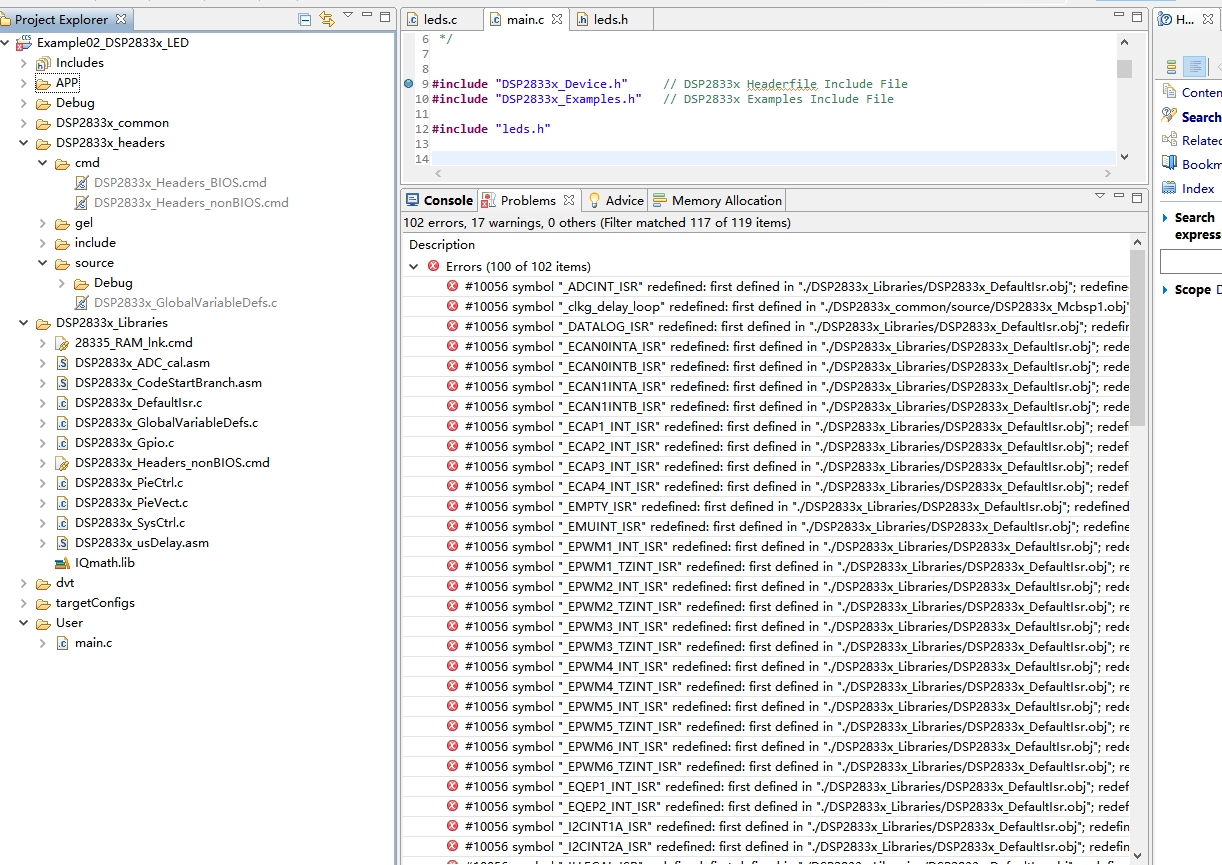 我找到了一个tms320f28335的例程,这个程序的库文件必须放在E盘根目录下程序才可以编译,我想把库文件直接放到主程序目录下,但是没有成功,所以请教一下大家。Example02_DSP2833x_LED这个是我的主程序,DSP8233x_ProjectExample这个是我的库文件文件夹,我想把库文件的DSP2833x_common和DSP2833x_headers文件直接放到我的主程序目录下。DSP8233x_ProjectExample.zip