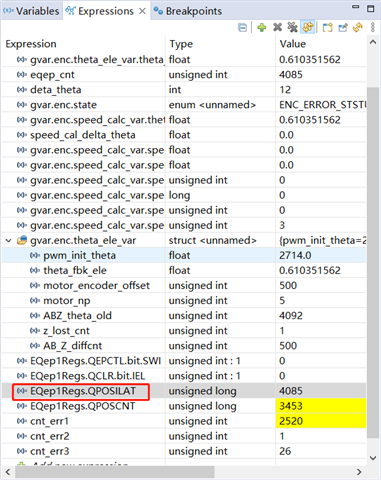 EQep使用中EQep1Regs.QPOSILAT,转速升高到1700后数值不在出现变化,貌似是不起作用了,停留在了某一个值,转速从正转速到负转速后变化一下,然后停留在某一值,此后EQep1Regs.QPOSILAT的值只会在固定的两个值间变化(当正负转速切换时)