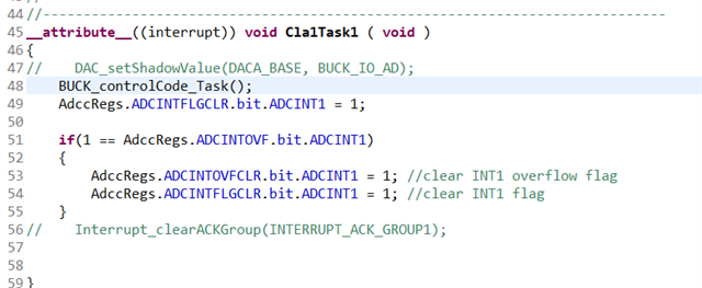 我的Cla_task 是通过ADC中断触发的  测试是正常触发 但是我在cla_task1调用了BUCK_controlCode_Task();  函数  目前怀疑函数没有执行,连函数里面赋值操作都没有实现,我想问一下具体原因,或者有什么办法可以实现断点一样的操作