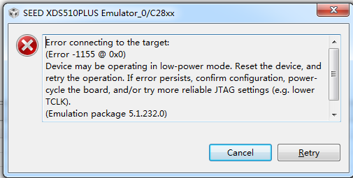 大家好,我在用DSP,tms320f28335连接到ccs进行仿真时,点击仿真按钮,在连接JTAG时,就会出现如下图所示的错误,不知道是什么问题,现在一点也没有头绪。不知道大家遇到过这样的问题没有,请大家提点建议,万分感谢。