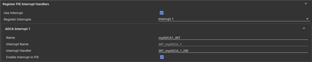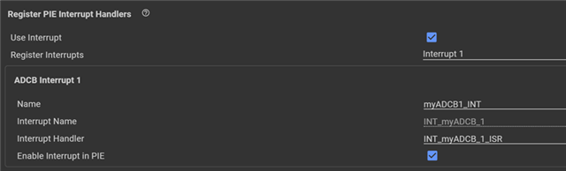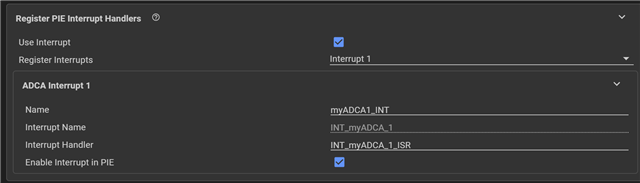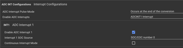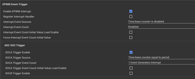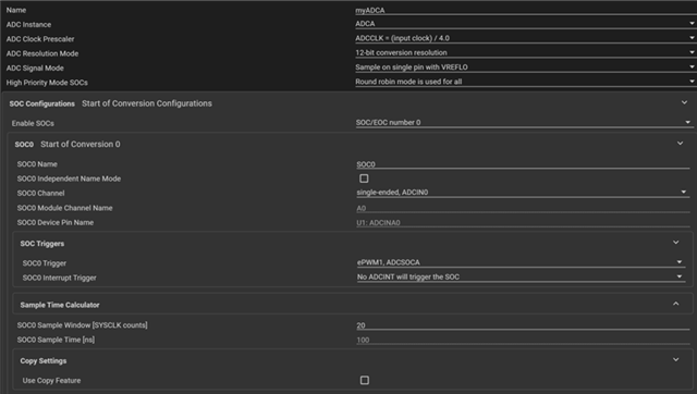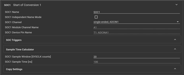 因此我在原来例程的基础上补充了一个soc的配置,如下面图所示(与例程设置一致),并且两个采样同时在一个中断服务例程中执行保存缓存区的操作,但是我在实际运行时发现多加了几个通道的采样和缓存会导致采样的精度有所下降(因为我采样后的数据要进行有效值计算,而算出来的有效值有一定程度的变化),我想请问一下是不是一个中断服务例程中进行多个采样数据缓存会降低采样精度,还是说只要有多个通道连接到板子上就会降低采样精度呢?如果采用多个中断来触发多个通道数据的采样缓存能否提升采样数据的精度呢?
