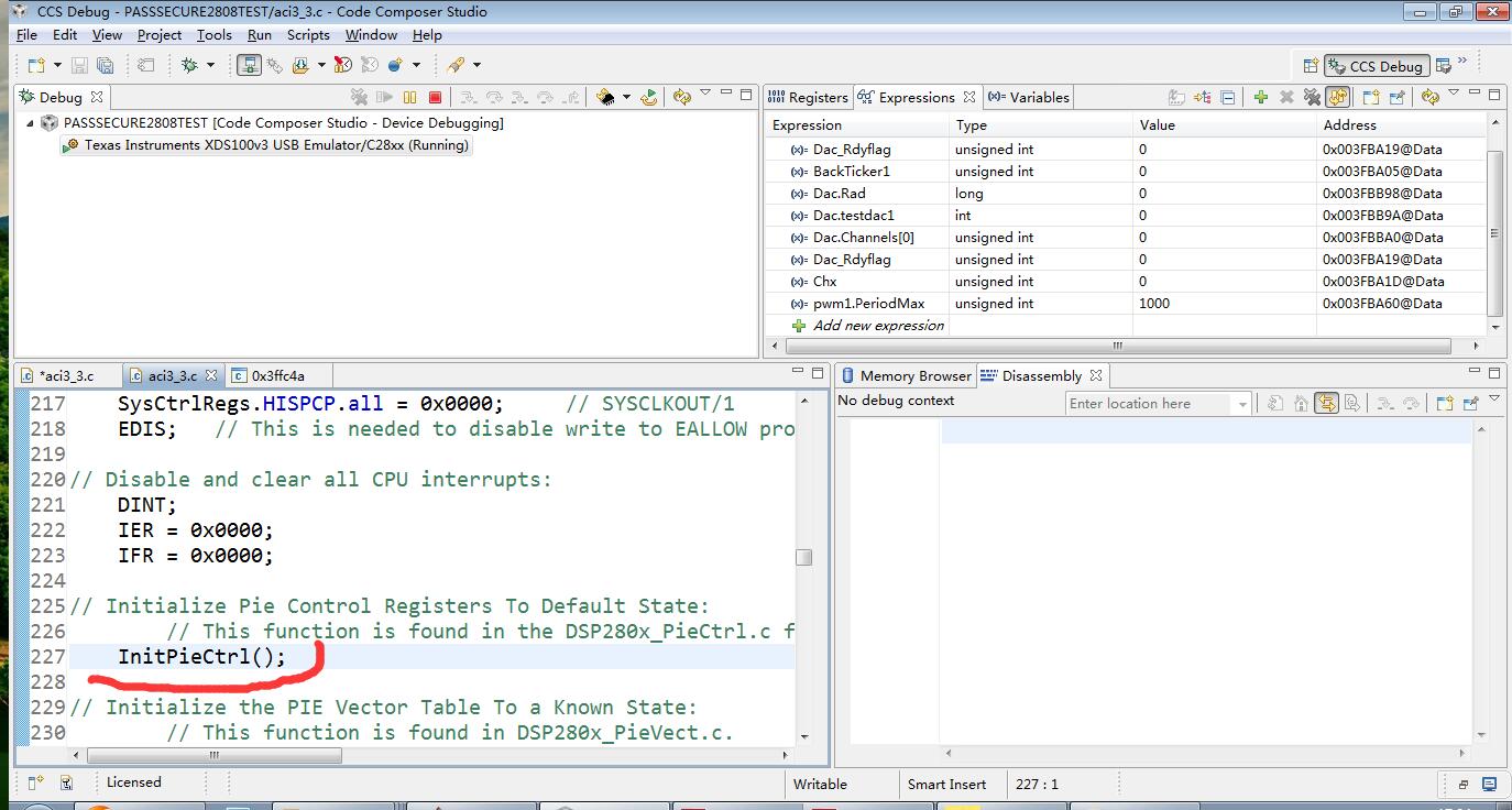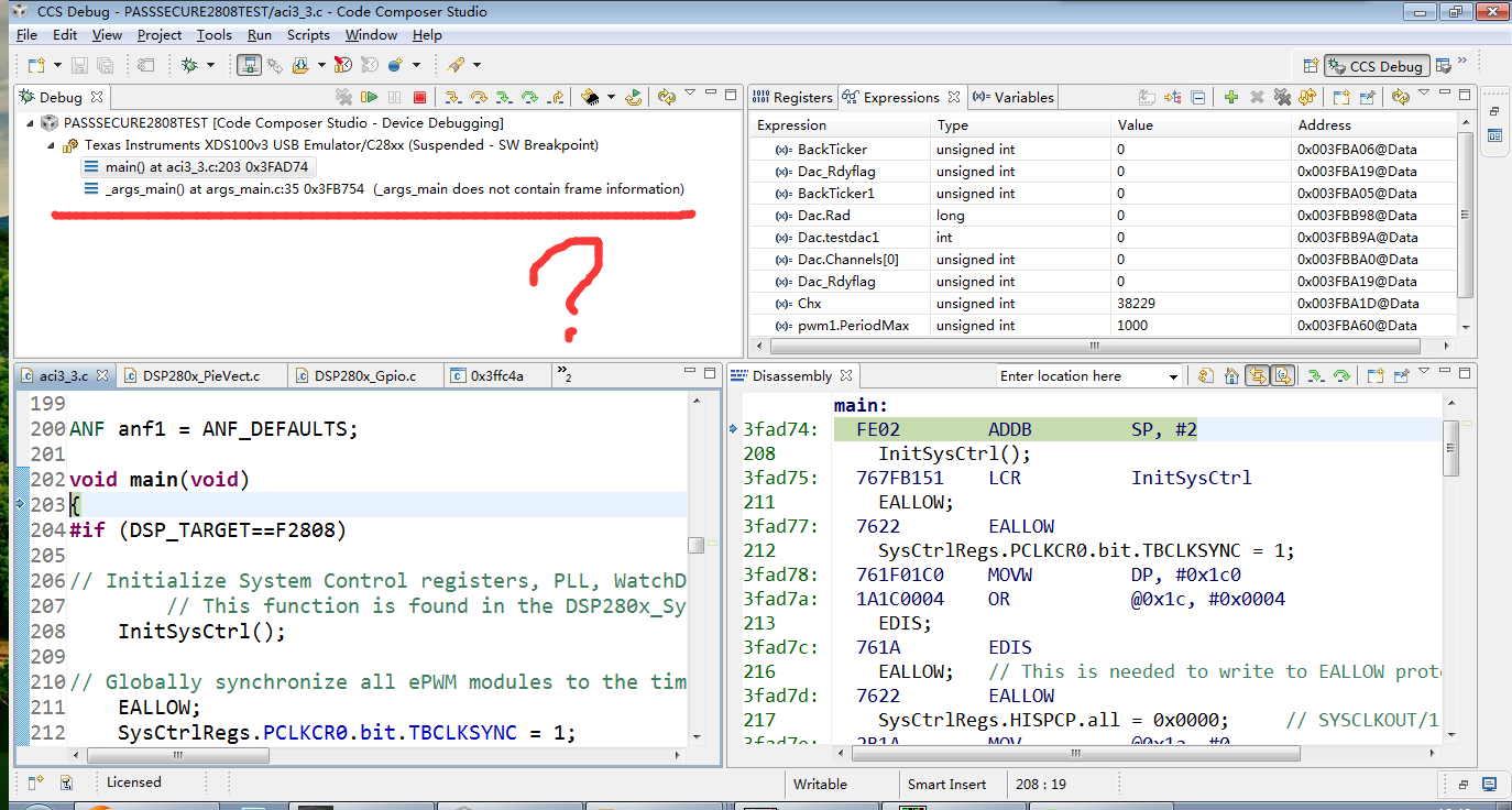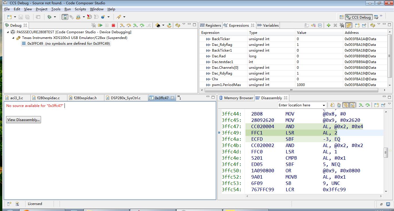 dsp2808,新的芯片,焊接到开发板上,仿真器能连上,可以跳过flash下到非安全区的ram里面单步运行简单的部分程序,但是不能全速运行(寄存器的值不变),“No source available for "0x3ffc47" ”