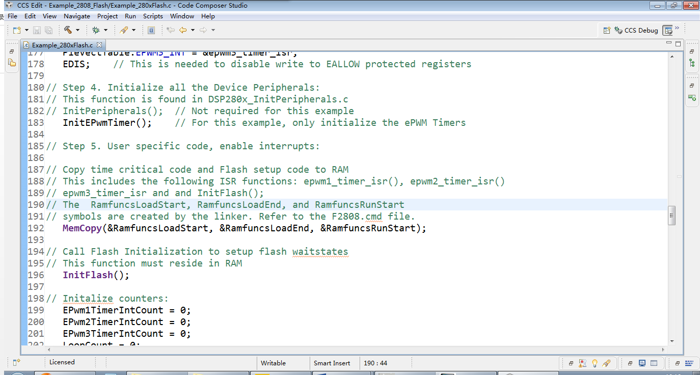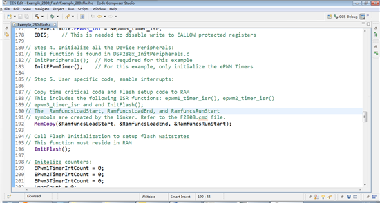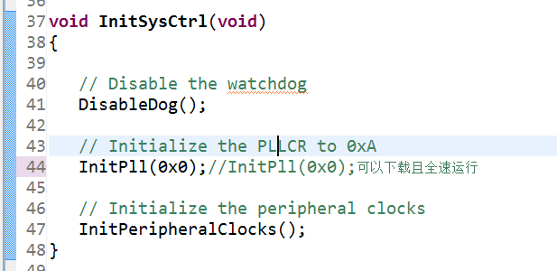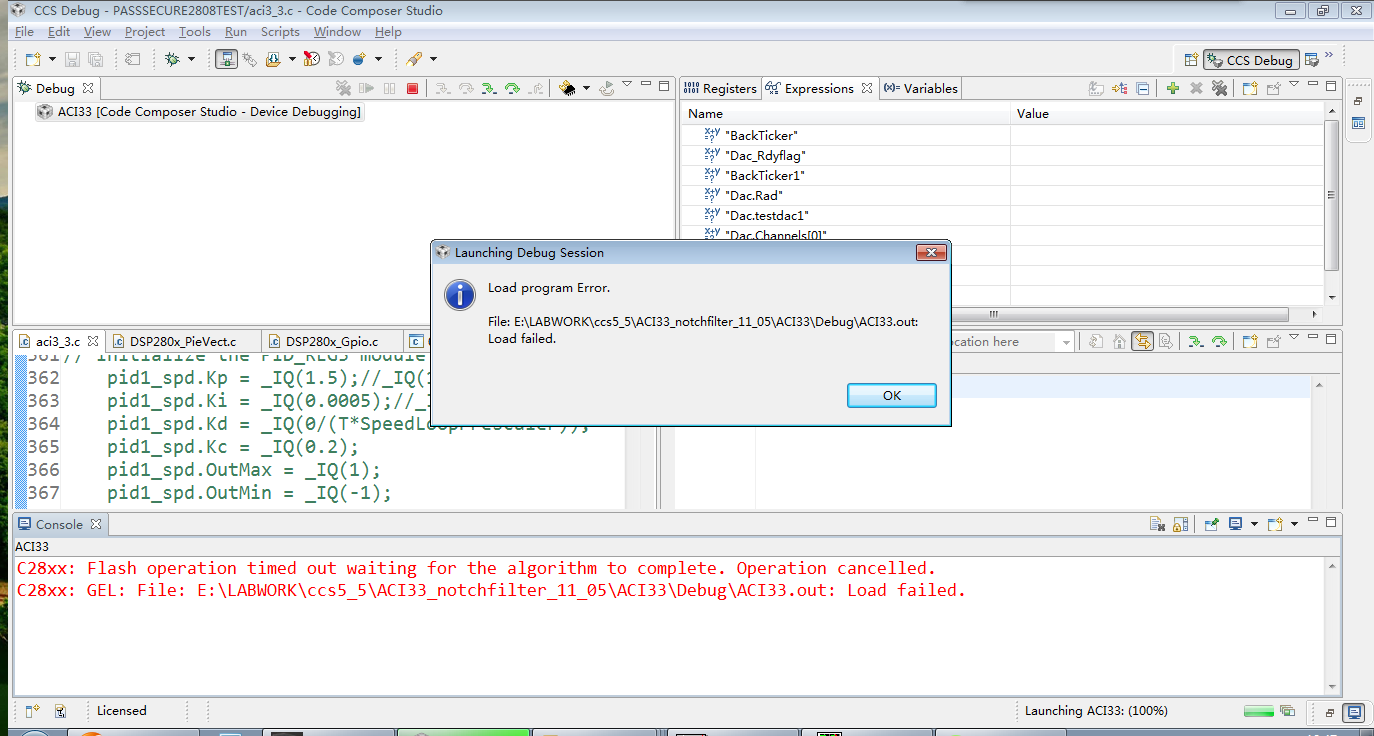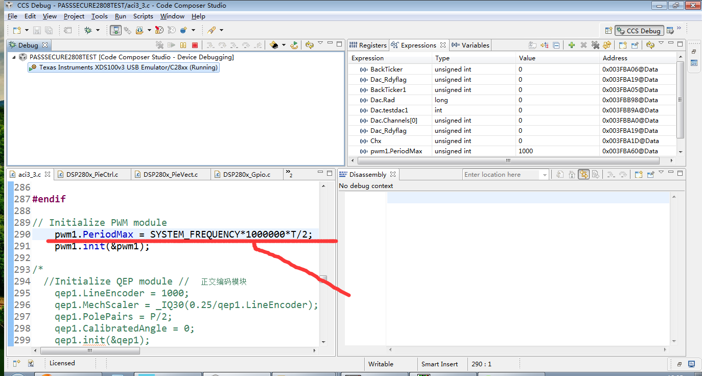 dsp2808,新的芯片,焊接到开发板上,仿真器能连上,可以跳过flash下到非安全区的ram里面单步运行简单的部分程序,但是不能全速运行(寄存器的值不变),“No source available for "0x3ffc47" ”