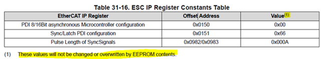 在测试ethercat的DC时候发现Pulse length of SyncSignals无法修改,查看寄存器0x0982的值始终为0x000A,与eeprom中Word Address为0x02中定义的长度(单位10ns)并不相符合。