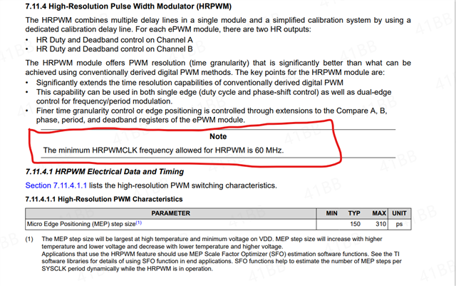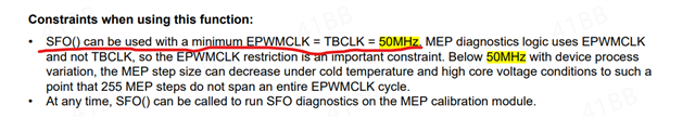 但是在上图2的技术参考手册上显示,HRPWM功能中需要使用的SFO()函数 的最小频率是50MHZ,这是说明HRPWM在50MHZ时依旧可以工作吗?