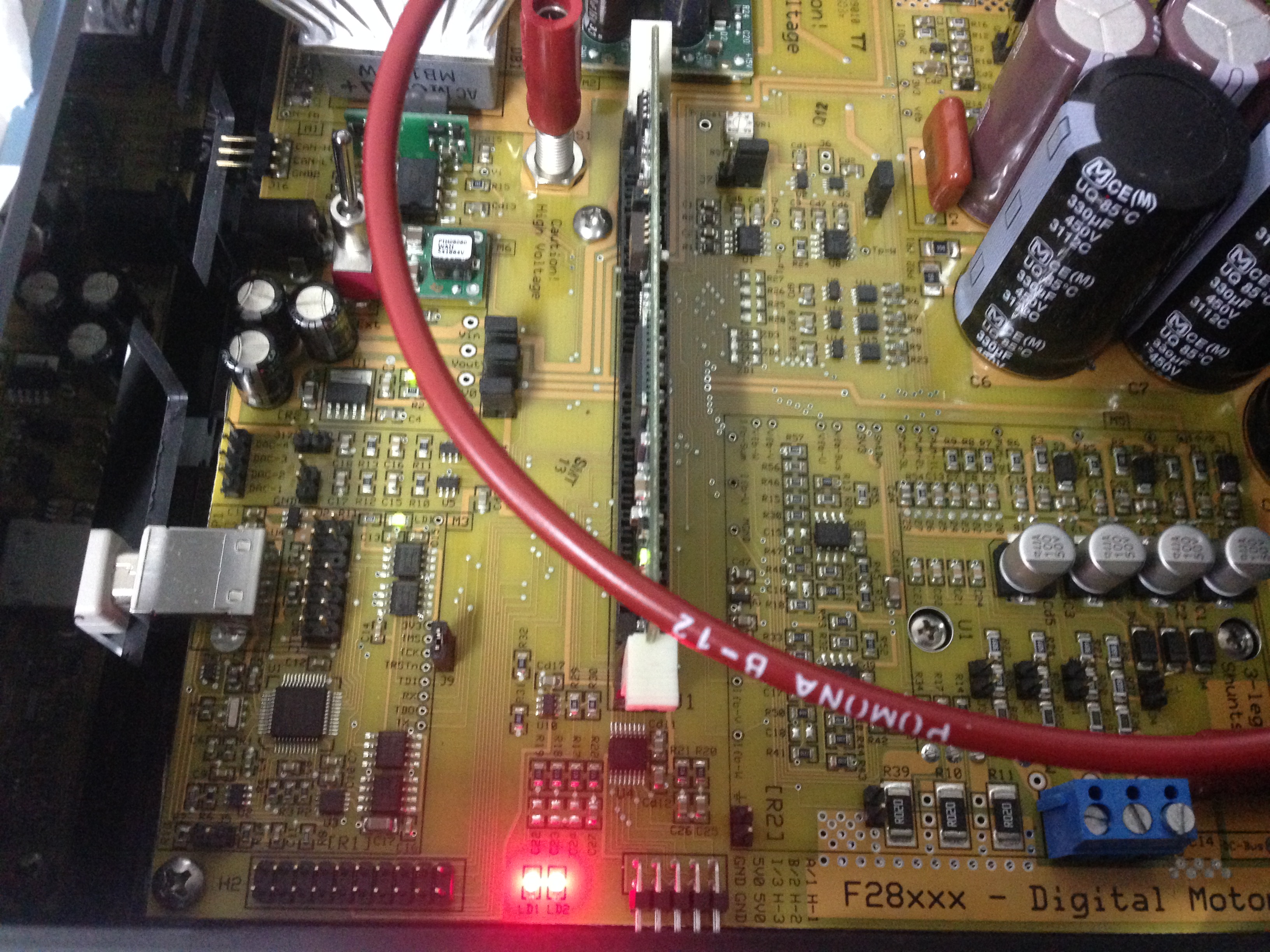 我买了一套TMDSHVMTRPFCKIT,随设备来的有28035和28335,前一段时间一直用的28035,尝试安装28335的时候板子上[main]模块的LD1和LD2都亮了,而28035这两个应该是过流指示,一般是不亮的,不知是什么原因!我仅仅更换了控制卡并上电,ccs和电机都没连!