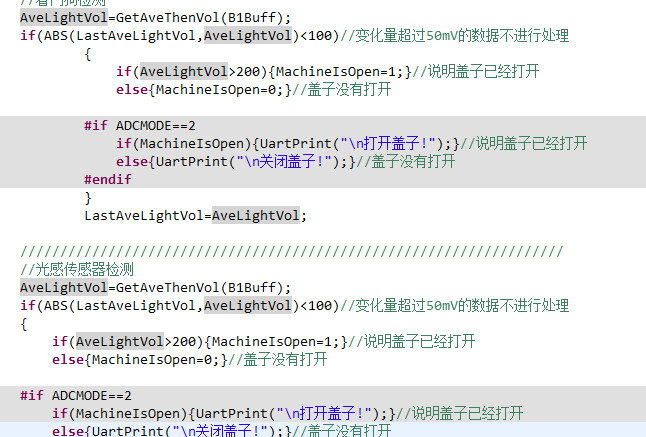 if(AveLightVol>200){MachineIsOpen=1;}//说明盖子已经打开