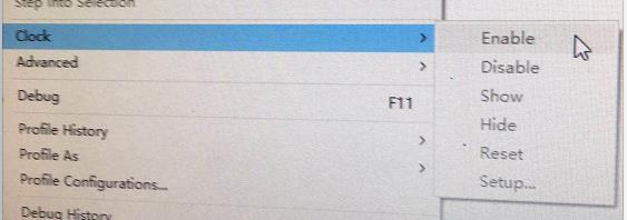 进入调试模式之后Run->Clock的选项是灰色的,不能enable。请问如何解决?十分感谢!