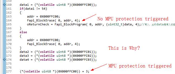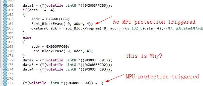 目前我已经设置了flash地址为0X000FFC00开始的1kb为只读权限,然后我尝试往这个地址去写数据(通过F021_API),实际却没有进入_dabort,但是直接取址操作赋值(*(volatile uint8 *)(0X000FFC00)) = 3;却会触发_dabort,这是为什么?