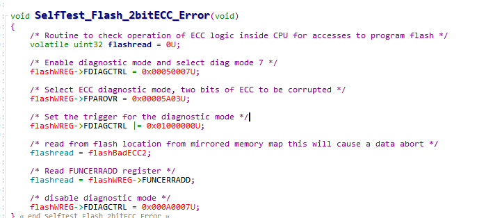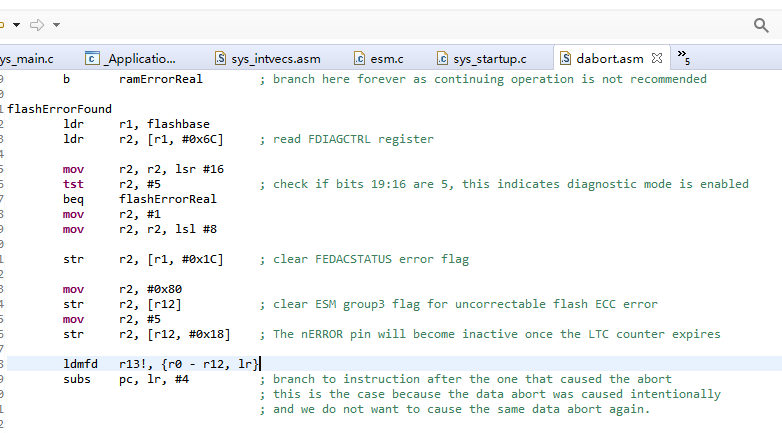 2、但有一点不太理解。产生错误后跳转进dabort.asm中,这里面的操作我不太理解,为什么要在这里面清掉错误标志、并且设置nERROR pin在计数器完后恢复高电平,特别是设置nERROR pin在LCT计数器完后恢复高电平,这个不是应该由开发者自己配置,假如开发者需要产生错误后这个引脚一直为低电平,来提示我它出现了错误。我配置成一直保持低电平的模式(esmREG->EKR = 0x0U;),但是在这个dabort.sam又给配置回去了。