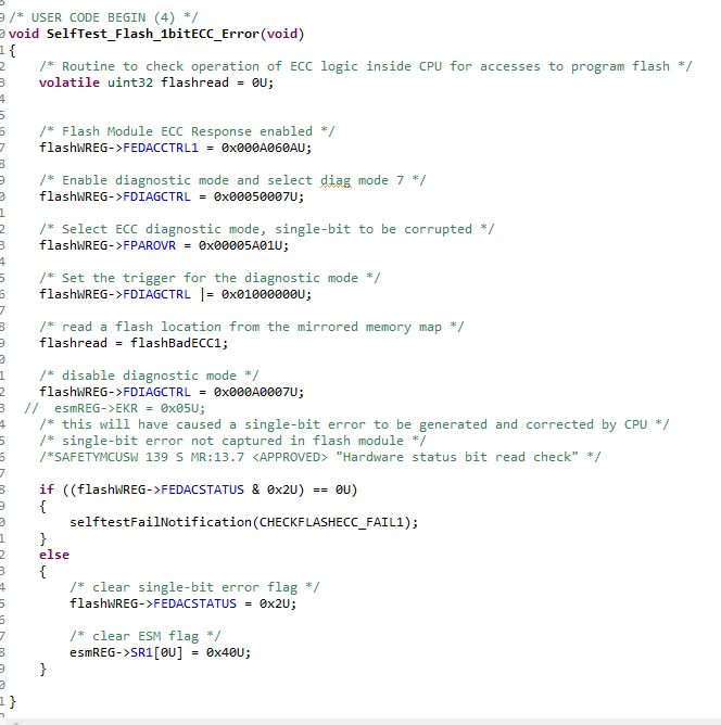 TI大神好,我在使用诊断库函数SL_SelfTest_Flash时出现下面问题。 retVal = SL_SelfTest_Flash(FLASH_ECC_TEST_MODE_1BIT, TRUE, &flash_stResult_1bt);这个运行的flash_stResult_1bt是ST_PASS.但是retVal = SL_SelfTest_Flash(FLASH_ECC_TEST_MODE_2BIT, TRUE, &flash_stResult_2bt);的flash_stResult_2bt为ST_FAIL;。请问是什么原因?