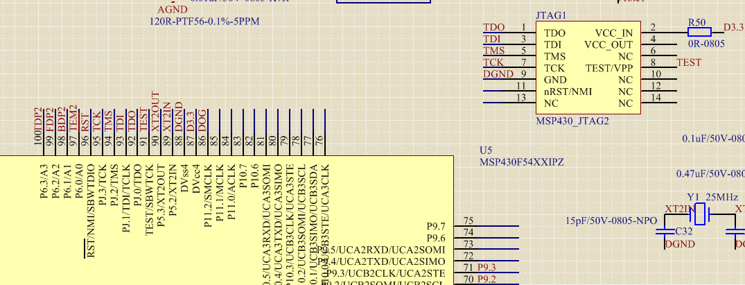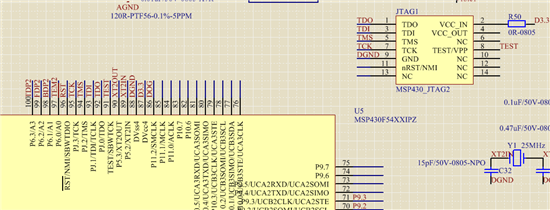 官方有MSP430F5438A推荐的最小系统的电路图吗?我上面的JTAG管脚链接有问题吗(R50电阻不焊)?