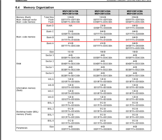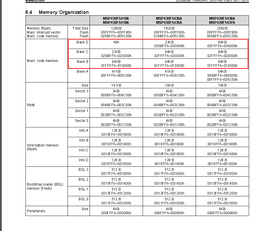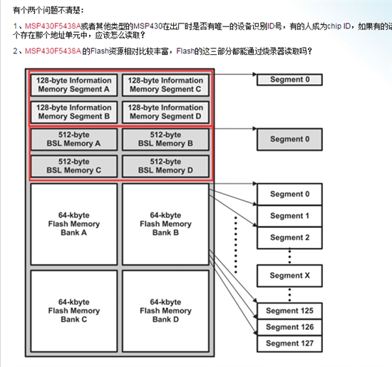 在使用MSP430F5438A这个芯片的时候,因为要存储比较大的数据量,用到了BANK D,起始地址为:0x030000,但是再擦除的时候发现每次擦除的每段都是512B,但是看到别人的帖子上截的图片每段是128B,请指点一下,谢谢!~~