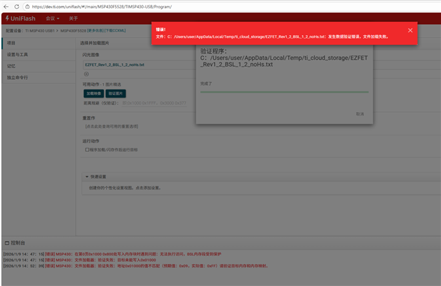 • 我用刚买的新的MSP430F5528焊接好在EZFET模块,首先USB连接电脑,设备管理器中仍然没有image.png这两个端口,然后我在uniflash中通过msp-fet430uif烧录EZFET的两个固件,仍然显示找不到设备。我注意到我EZFET中的5528芯片旁边的晶振表面似乎有被我焊接的时候烧焦的痕迹,于是我怀疑是晶振坏了。在我换完晶振以后,果然uniflash里面可以检测到5528芯片,但是烧录bsl固件的时候出现了这个问题,请问该如何解决