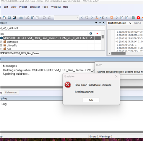 •  我将擦除的选项设置为允许擦除,并选择第三项后成功将EZFET两个固件烧录进去,目前EZFET的LED正常亮起来,设备管理器中也出现了 这两个端口,由于我之前为了验证EZFET晶振是否坏了就把HID桥模块的晶振拆下来焊接到EZFET模块,结果验证了EZFET晶振损坏的事实,现在我在缺少HID桥晶振的情况下尝试给6043烧录代码,在IAR中显示初始化失败 ,uniflash中也同样的显示 ,请问该如何解决