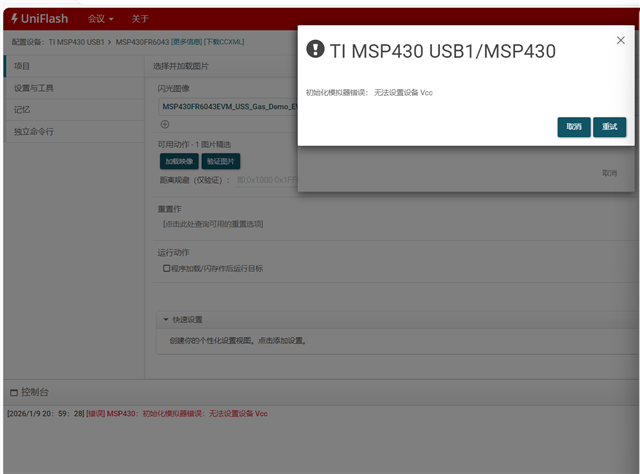 然后我连接到JTAG准备直接给MSP430FR6043烧录的时候,同样显示找不到设备。