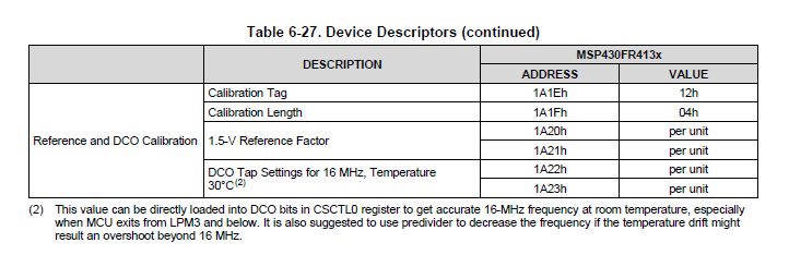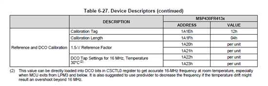 以前MSP430G2xxx系列内部的DCO出厂的时候有校准,校准参数存在information memory里面,FR4133没有同样的机制吗?找了好久没看到有关于FR4133 DCO校准的说明。谢谢!