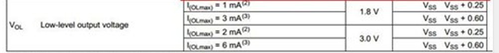 对于430单片机是否引脚所能承受的最大灌电流就是Vol下的Iol(如图示),而对于TI其他的芯片例如3-8译码器(TTL 或者 CMOS)是否也是同样定义的。而整个芯片所能承受的灌电流在没有具体标出的情况下是否可以认为是每个引脚最大能承受的灌电流之和?