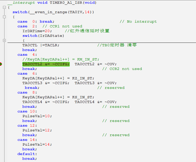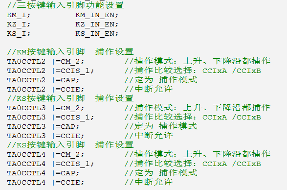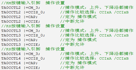 想 采用TA0 定时器 的 TA0CCTL2、TA0CCTL3、TA0CCTL4 捕捉功能,完成 三个按键的输入。出现个问题: 程序运行时一直出现TA0CCTL2 中断,没有任何按键的情况下也一直进入中断函数的TA0CCTL2处理部分, 当把TA0CCTL2 屏蔽后,中断运行正常。