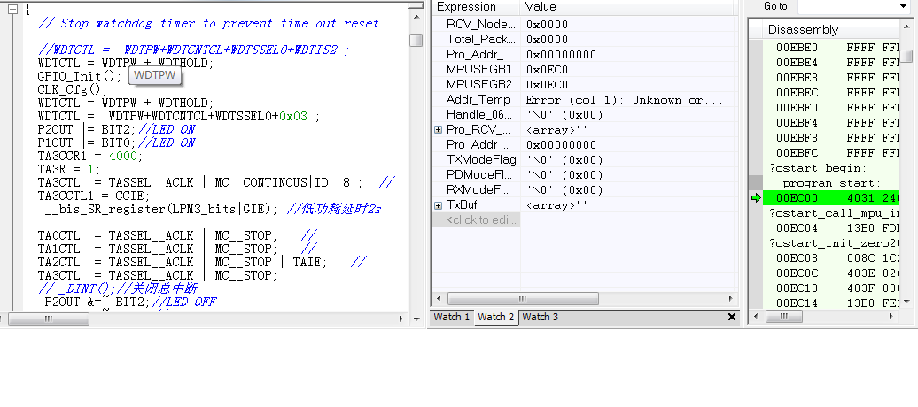 我现在用MSP430FR5969 做程序更新,引导程序经常出现可以正常下载,但一往下执行程序就跑飞,停在?cstart_begin:_Program_start的汇编代码处(如附件所示),但此现象有时候对工程Rebuilding All一下就不存在了,请问是什么问题,谢谢!