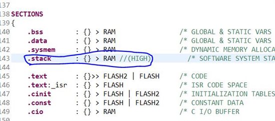The HIGH specifier used on the .stack section allocation causes the linker to attempt to allocate .stack into the higher addresses within the RAM memory range.