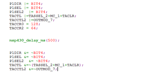 然后我按键后需要延时8秒做相应操作,按照常规的配置发现无法延时,后来查程序发现TACTL是共用配置的,在关断PWM后,timerA延时的那个配置已经覆盖了,另外我关断PWM操作那样写是因为之前测试将PWM占空比直接设置成0时,关断后会有频率较小的一些方波,求问这个配置冲突该怎么解?