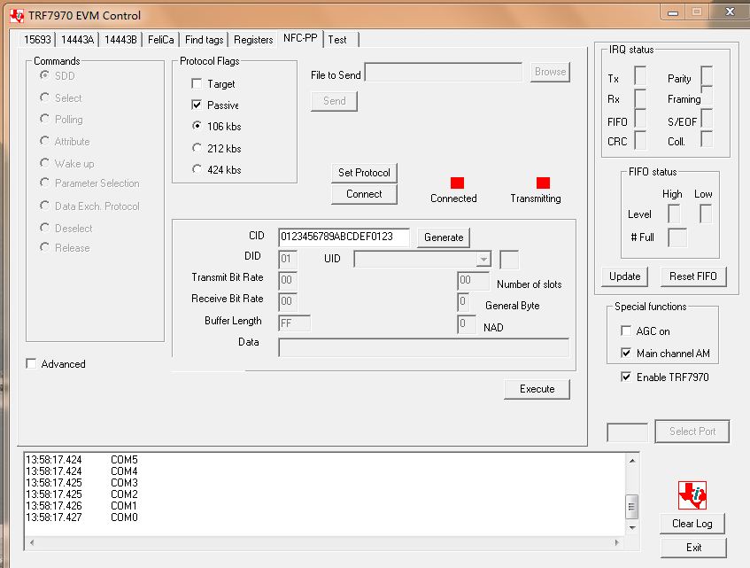 我尝试用两块TRF7970A EVM开发板模拟实现NFC点对点连接,按照参考文档所述: