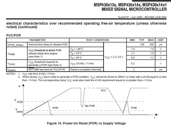推荐按照TI参考设计来,本身MSP430F149对Vcc和reset时序均是由要求的。Vcc要求VCC rise time dV/dt ≥ 1V/ms. Reset信号至少需要2us。 你可以用示波器看看你的设计。如果本身电池供电时供电能力不足,或者添加了特别大电容,或者由于焊接不良等其他状况,导致寄生电容特别大,导致Vcc上电不满足时序,有可能会导致芯片不能正常启动的。故除了Reset管脚一般建议上拉4.7KOhm到Vcc, 1nF电容到地外,还需要关注本身Vcc上电是否满足要求。