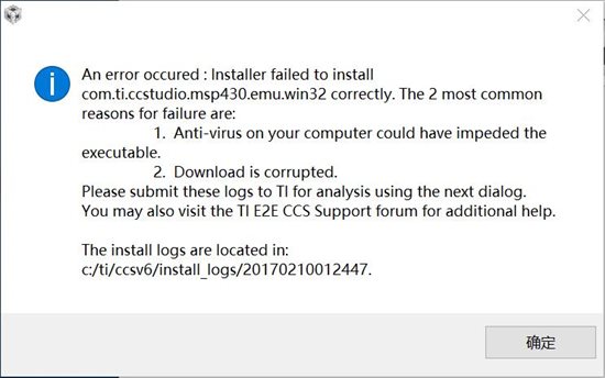 Win10 64位系统,尝试安装过CCSv5.5,v6.0,v6.2,安装时杀毒软件与防火墙均已关闭,都遇到如下问题而中断,安装日志见附件。求助!!!